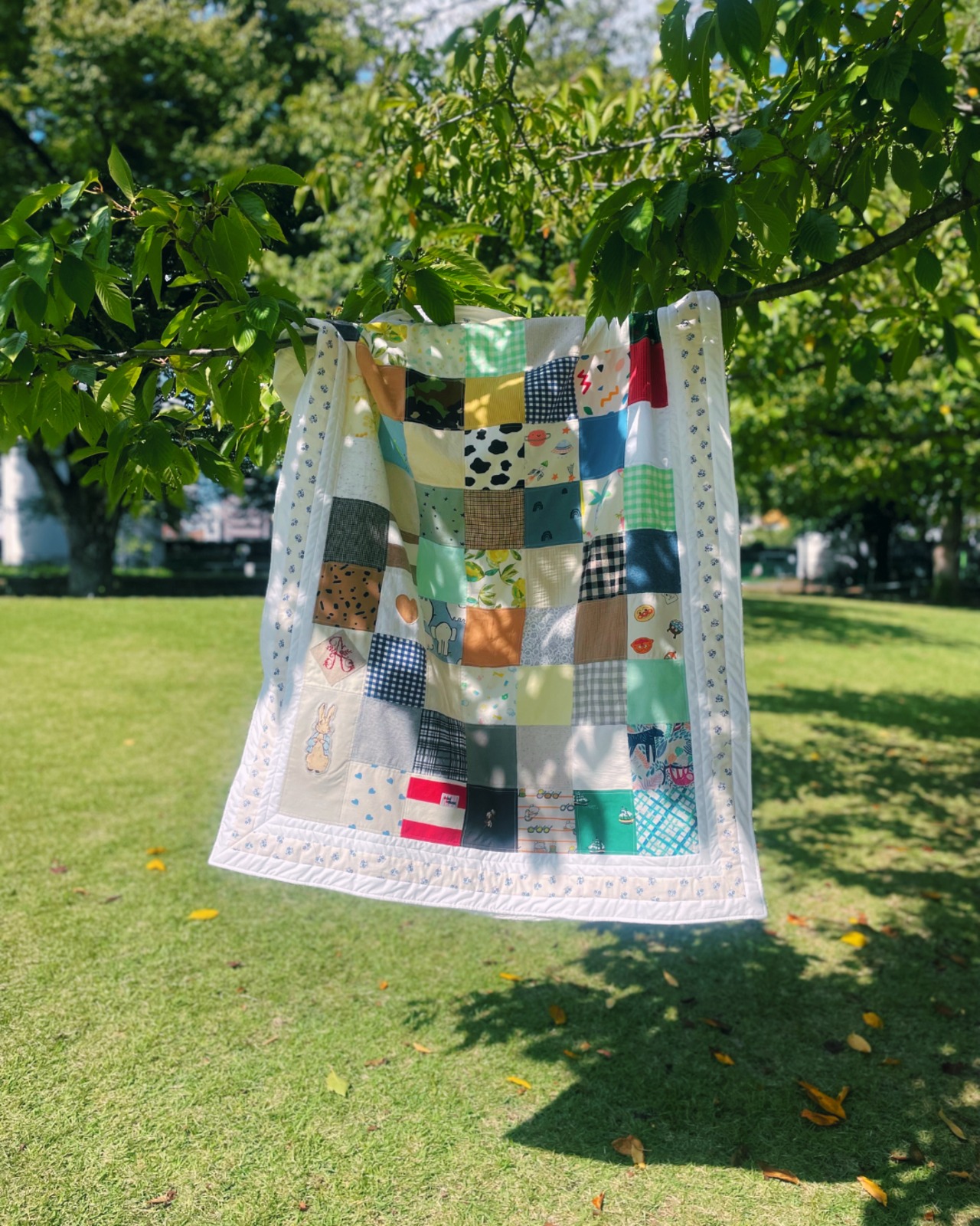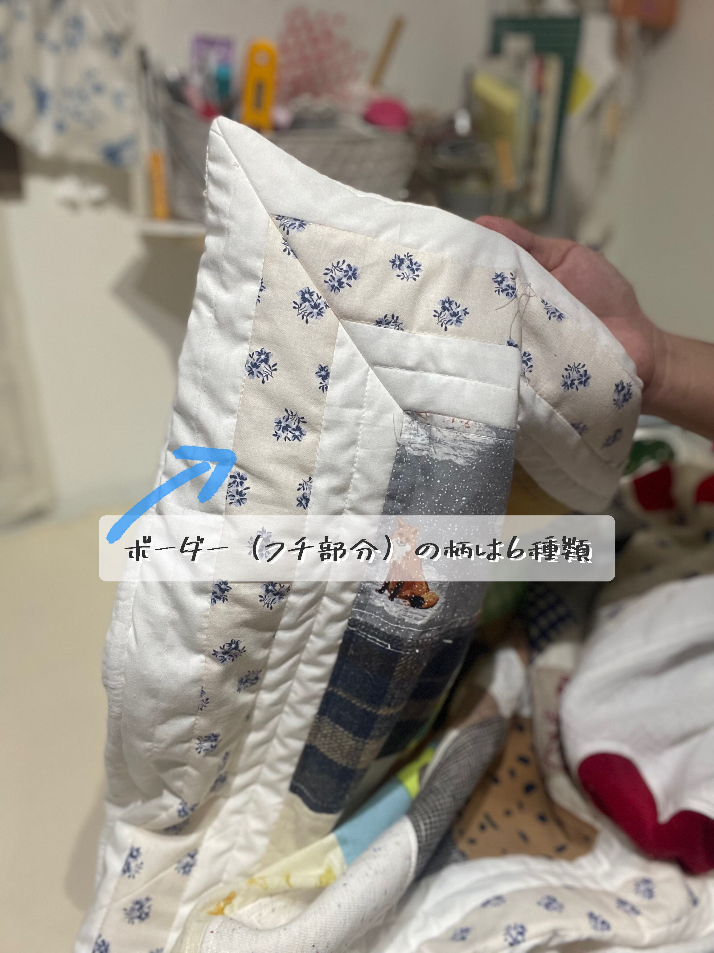 ボーダーには額縁風にしてキルト綿を入れ、ふわふわにしてあります。また繋ぎ合わせた縫い目が出ることをご了承くださいませ。